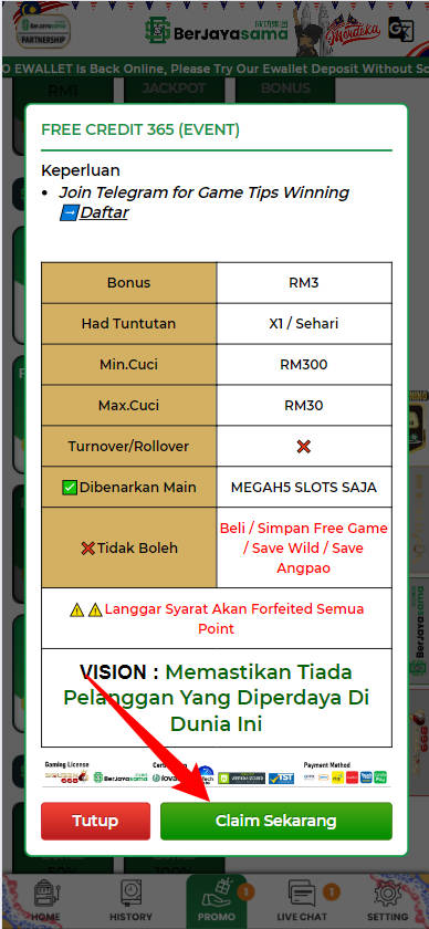 | Berjayasama | – RM3 Free Credit 365 – Claim once a day – Playable on MEGAH 5 slot games only | Free Credit Link |