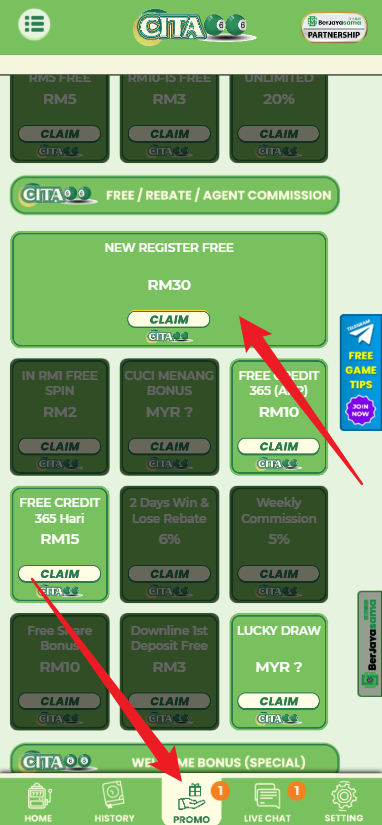 To receive RM30 in free credit at Cita66 without making a deposit, follow these simple steps: