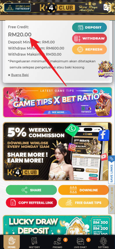 Follow these easy steps to claim RM20 free credit at K4CLUB with no deposit required: