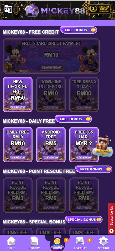 The Mickey88 RM50 Free Credit No Deposit promotion is an exclusive offer extended to new players upon registration. It grants players RM50 in free credit without requiring any initial deposit.