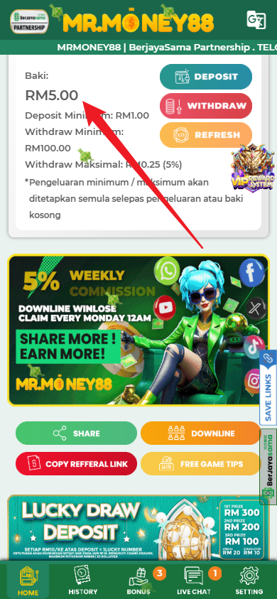 - Check your MRMONEY88 account to confirm that the RM5 bonus has been successfully credited.
